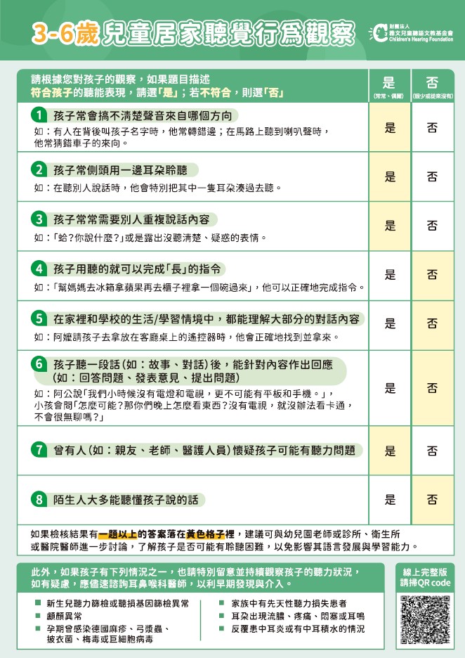 本檢核表由財團法人雅文兒童聽語文教基金會研發,提供家長及幼兒園教師觀察滿3歲至未滿7歲幼兒聽能表現之工具,填寫後可取得聽能表現風險指數及相關衛教資源。 ★線上檢核表: https://klip.chfn.org.tw