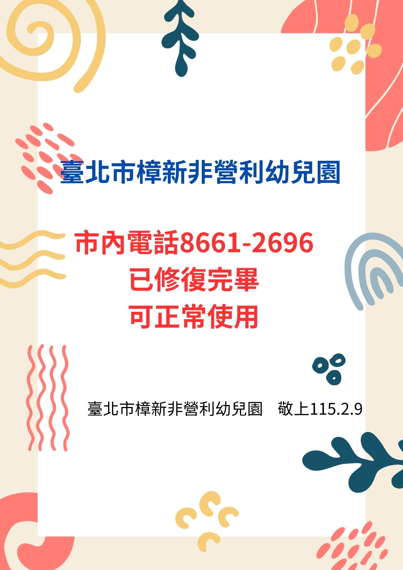 115.2.9樟新幼兒園市話8661-2696修復完畢